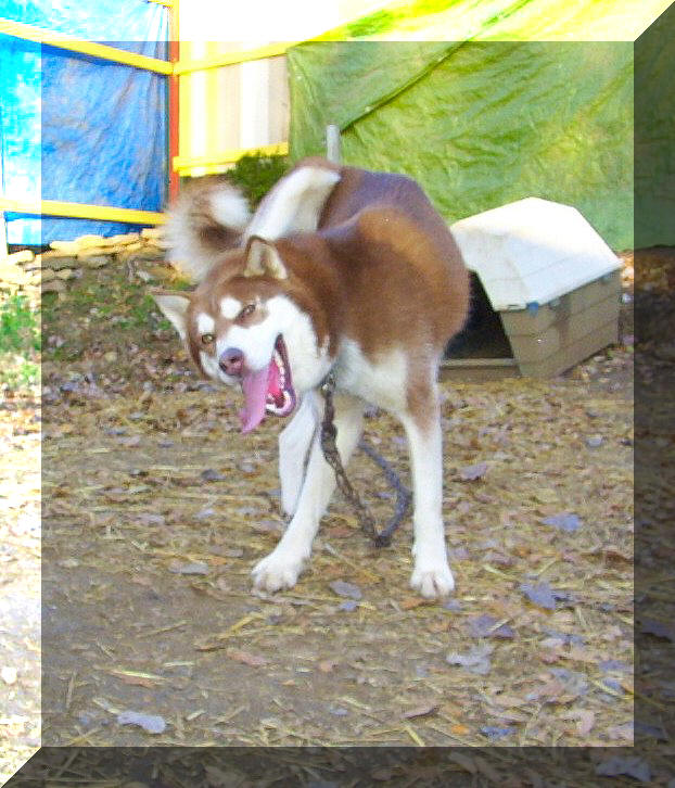 Mufazza gave me a perfect, jokester of the pack, pose here. I call him the jokester because he jumps up in the air when he wants attention, and because he loves to play all the time. He's always trying to get the other dogs to join in the action. With a pleasant personality he loves to play fetch, but is hyper and doesn't tolerate strangers in his territory. He has become a real good watchdog for us which is rather unusual for a Siberian Husky. Our hopes is to breed him to Tifa (but I think she is too old now) or to another female we plan to get next year or in 2 years. Until then he will just have to play with the other dogs in order to have fun. |