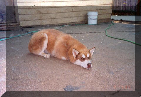 Mufazza is 8 months old in this picture. He has a look of I didn't do it even though he probably did. His favorite fetish is chewing up shoes, especially mine. This got him into lots of trouble in the house and he was therefore banned to the outdoors when spring came. You can see he had a very blondish copper coat that became dark copper with age. He does lighten up some during the winter though but not to this extent. |